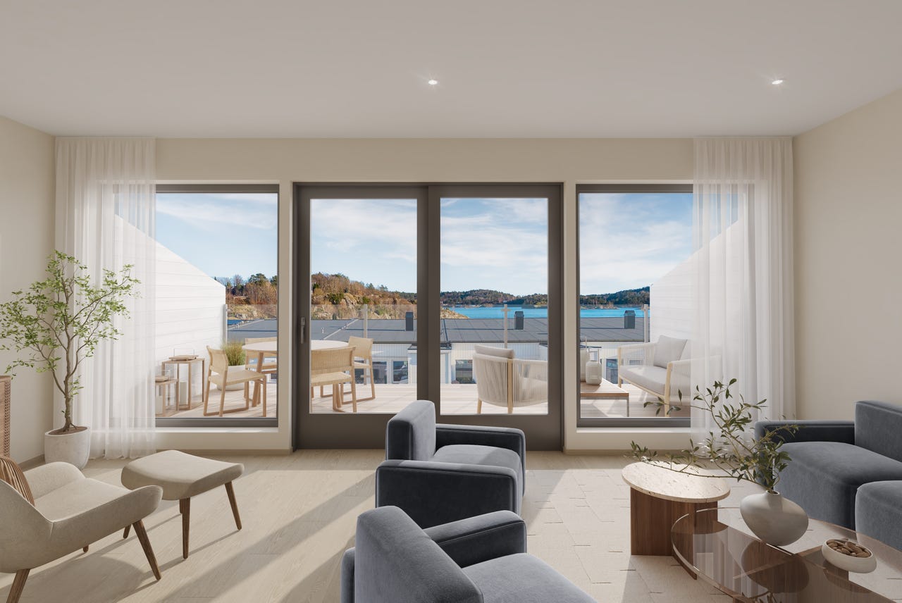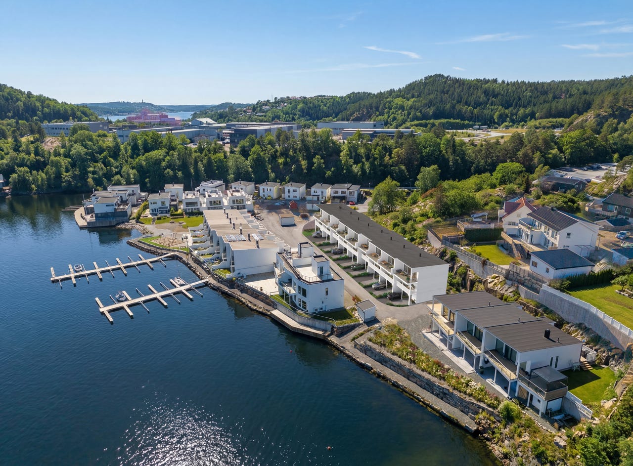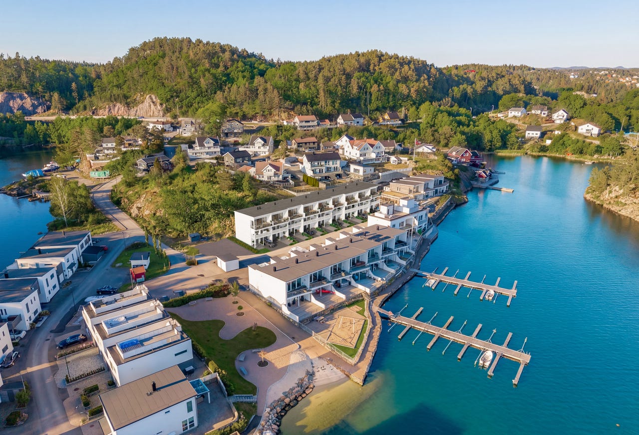 9 moderne rekkeboliger med 3 soverom, utsikt til Tromøysund, solrike terrasser og sjelden mulighet for båtplass i bryggeanlegg.